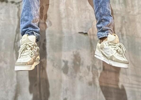 The LV Skate sneaker, crafted from grained calfskin, is inspired by '90s skate shoes. This design is distinguished by an ultra-padded collar and tongue, as well as a technical rubber sole adapted from the LV Trainer model. It's completed with distinctive details, such as a large Monogram flower on the side and "Vuitton since 1854" lettering on the back.