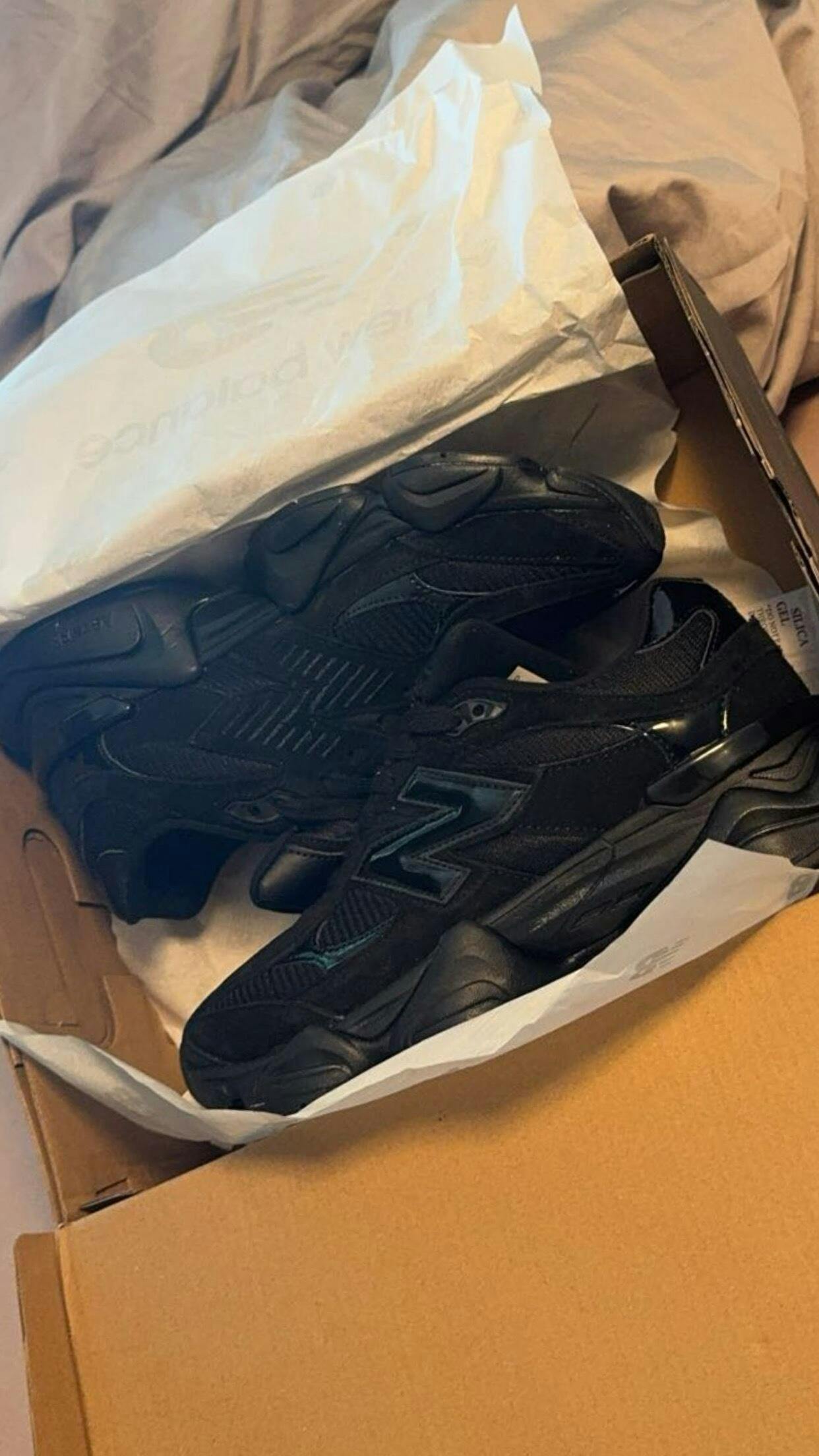Esta versión de las New Balance 9060 está fabricada con una base textil negra para la parte superior. Las superposiciones de charol negro brillante conectan la puntera con los cordones y la entresuela, y también se extienden hacia atrás desde la parte superior de los cordones para formar el soporte del talón. Las superposiciones de gamuza negra forman la puntera y recorren las entresuelas, mientras que el logotipo de New Balance N aparece en el lateral en charol negro y en el otro lado en un diseño discontinuo. Un logotipo de NB adorna el talón y la lengüeta también contiene elementos de la marca. Un contrafuerte de TPU negro brillante sostiene el talón y toda la zapatilla se asienta sobre una suela exterior de goma negra gruesa y ondulada.