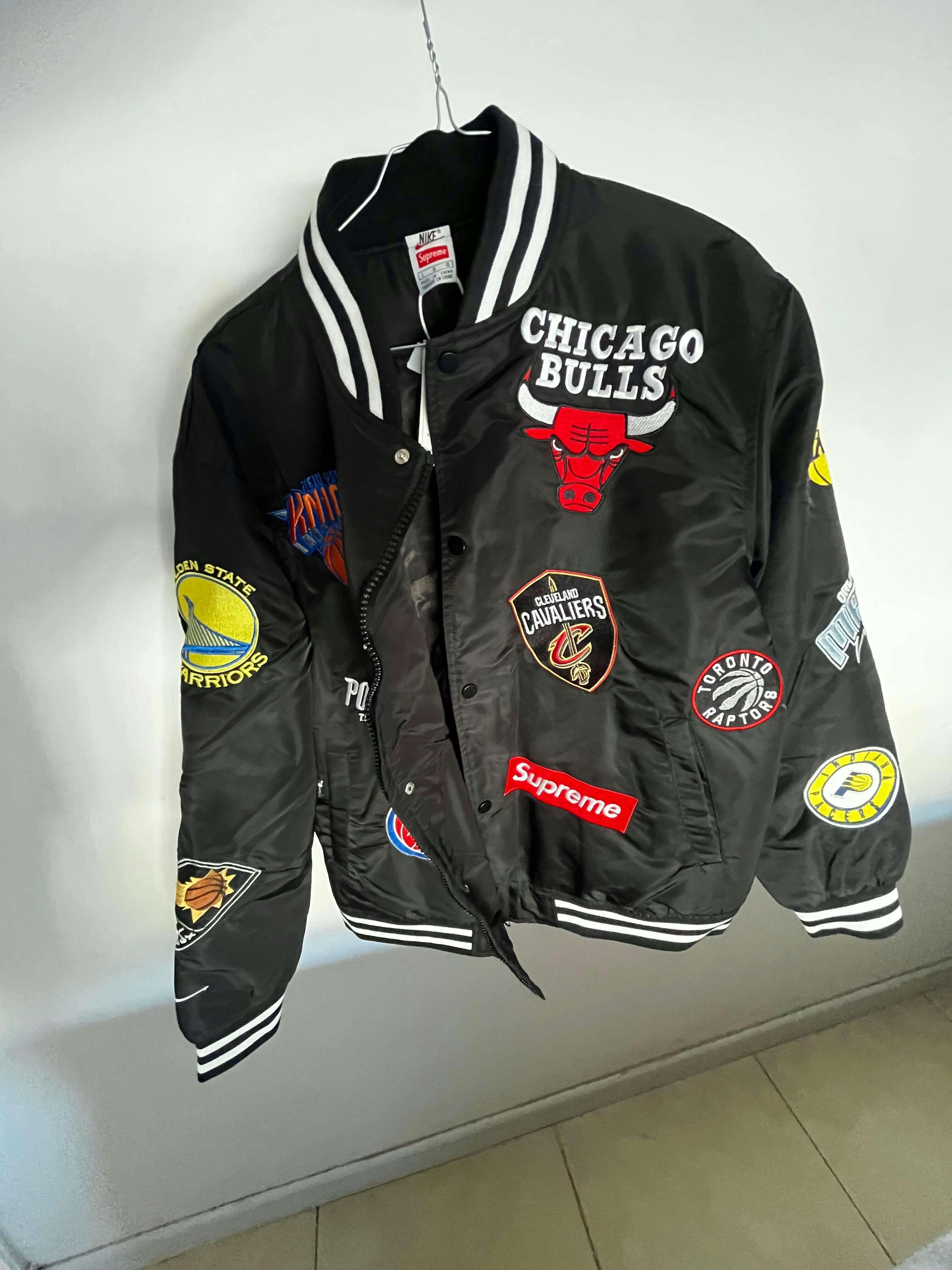 It is constructed from denim fabric with a cotton lining material on its hem, crew neck, and cuffs, showcasing the brand´s logos. The front part of the jacket features the Chicago Bulls logo on the chest, the Cavaliers logo, and the Supreme logo in a red colorway on the right side, while the Knicks, Portland, and Pistons emblems are displayed on the left. On its back, appears the Nike Swoosh which cuts across various NBA logos also featured on its sleeves.